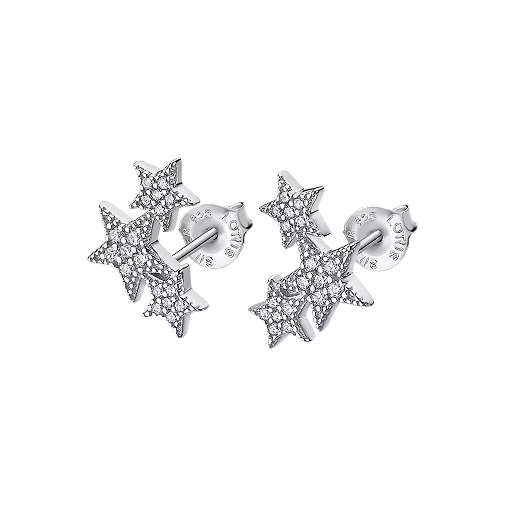 Pendientes en plata de ley 925mm de la colección Lotus Silver Fantasy con baño de rodio, modelo de tres estrellas, tipo trepador, con 12 circonitas blancas engastadas. Tamaño 13mm.Cierre de presión.