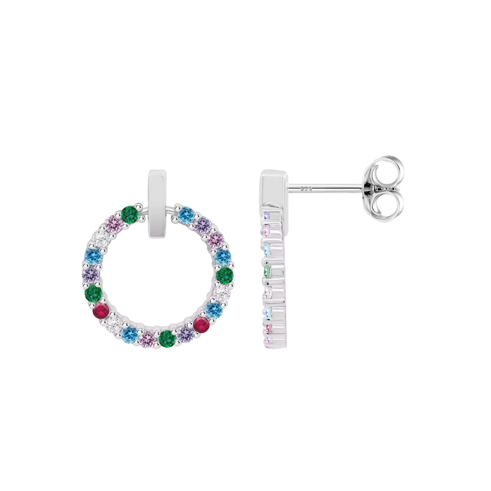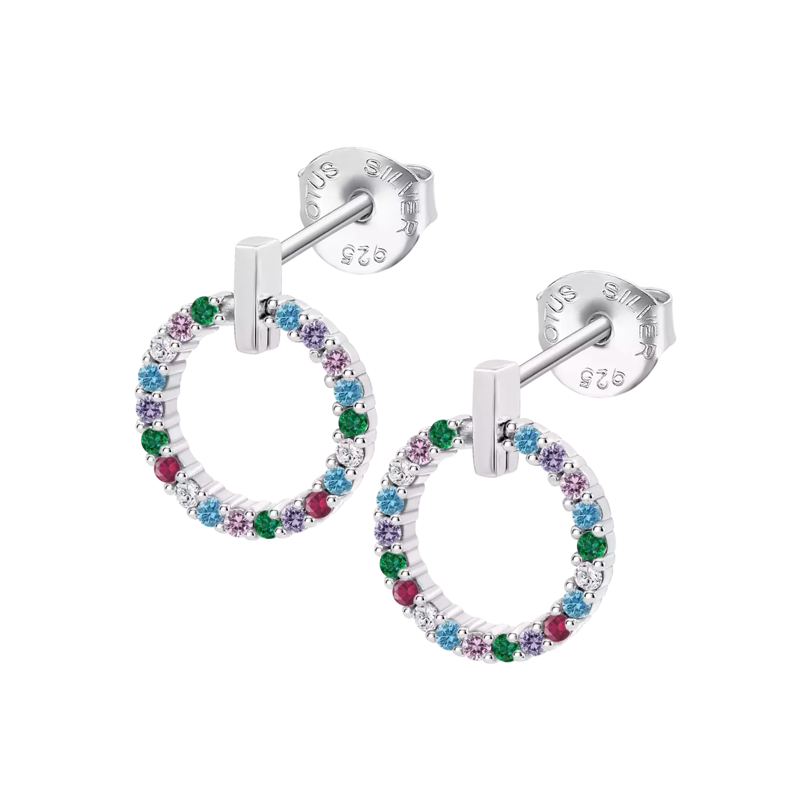 Pendientes en plata de ley 925mm de la colección Lotus Silver con baño de rodio, modelo en forma de aro frontal de 13mm con circonitas multicolor engastadas. Colgantes. Tamaño 13mm.Cierre de presión.