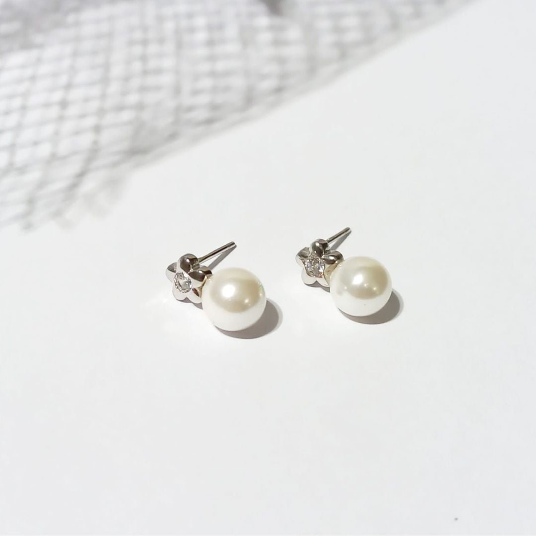 Pendientes de plata 925mm con baño de rodio modelo de perla redondeada de 7.25mm con adorno de flor con circonita. Cierre de presión.