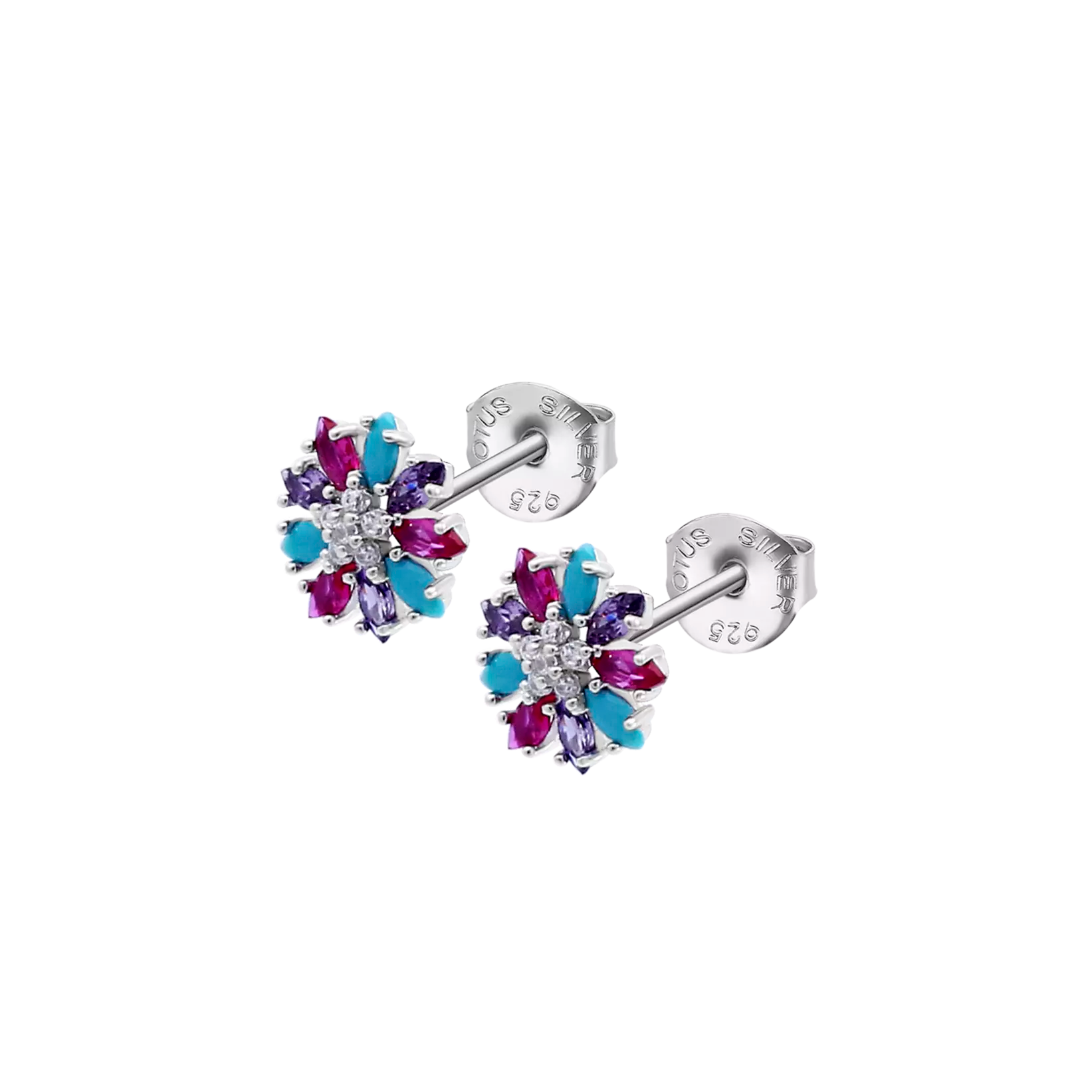 Pendientes en plata de ley 925mm de la colección Lotus Silver Pure Colors con baño de rodio, de roseta en forma de flor con 5 circonitas engastadas en color blanco y 9 multicolor. Tamaño 8mm.Cierre de presión.