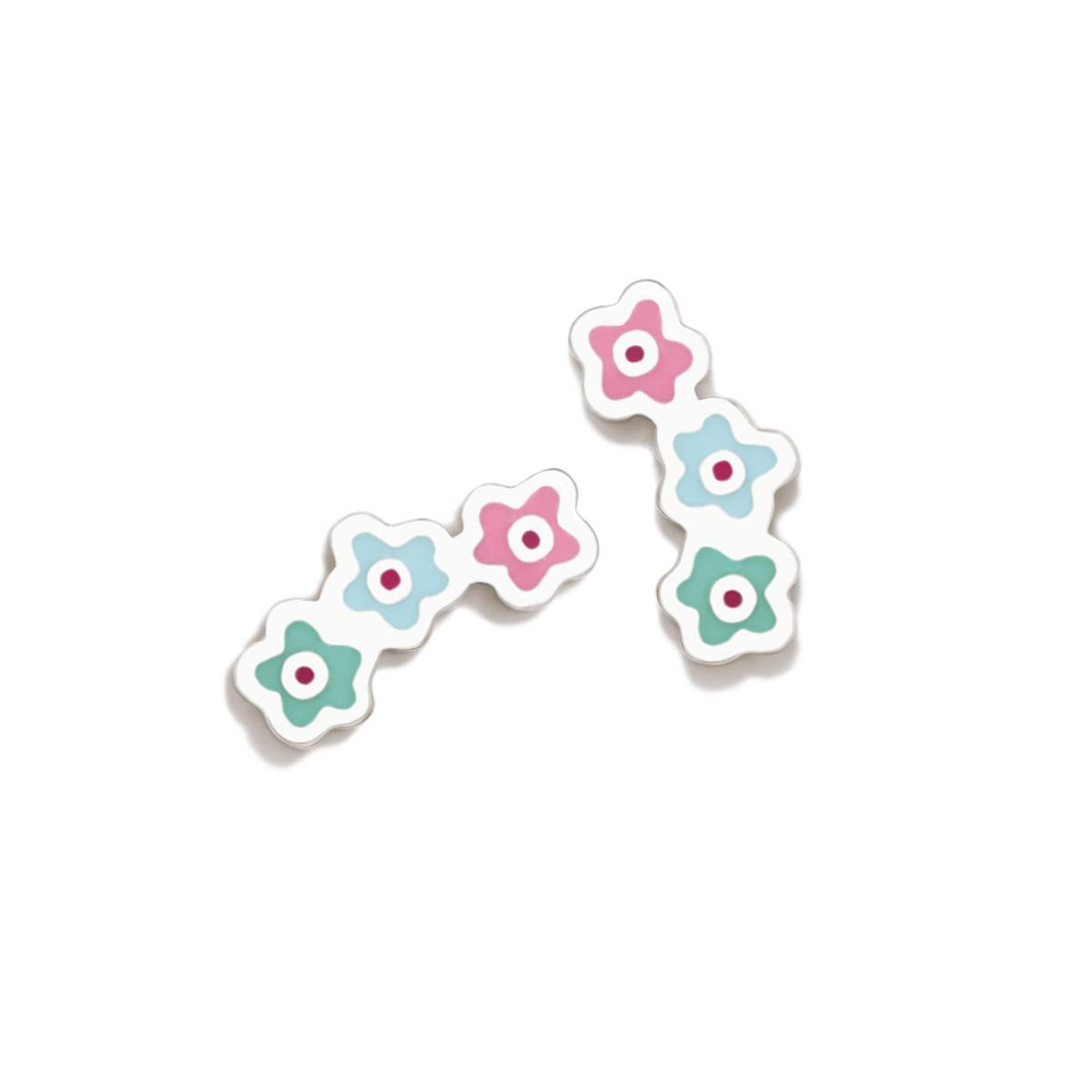 Pendientes de plata de ley 925mm con baño de rodio de flores de esmaltes en colores rosa, verde y azul. Trepadores con cierre de presión.