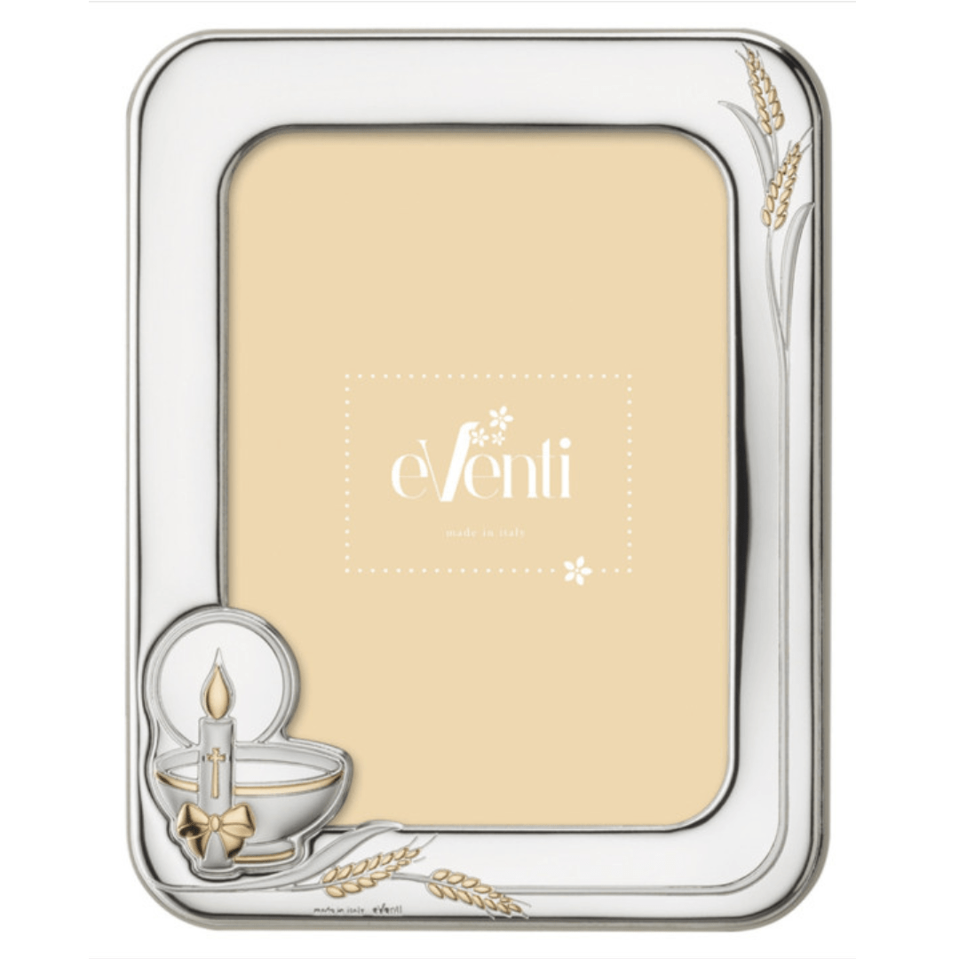 Marco de plata para bautizo con acabado brillo adornado con espigas, vela y pila bautismal en mate brillo y dorado. Medida 15*20 cm