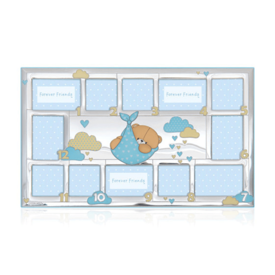 Marco de plata Mi Primer Año con osito amoroso sonriente y esmaltes de colores azul beige y amarillo en nubes y corazones .Fotos para 12 meses. Medida 31x19 cm ,trasera de madera color azul bebé. Precioso marco de plata para las fotos tan especiales que adornará la habitación de tu bebecito.