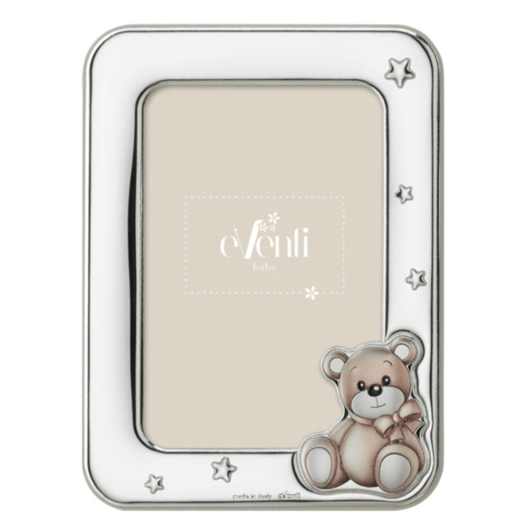 Precioso y dulce marco de plata de osito con lacito en plata y esmalte en tonos beige y blanco con estrellitas. Su medida es de 15*20 cm y su trasera es de madera beige-blanca.