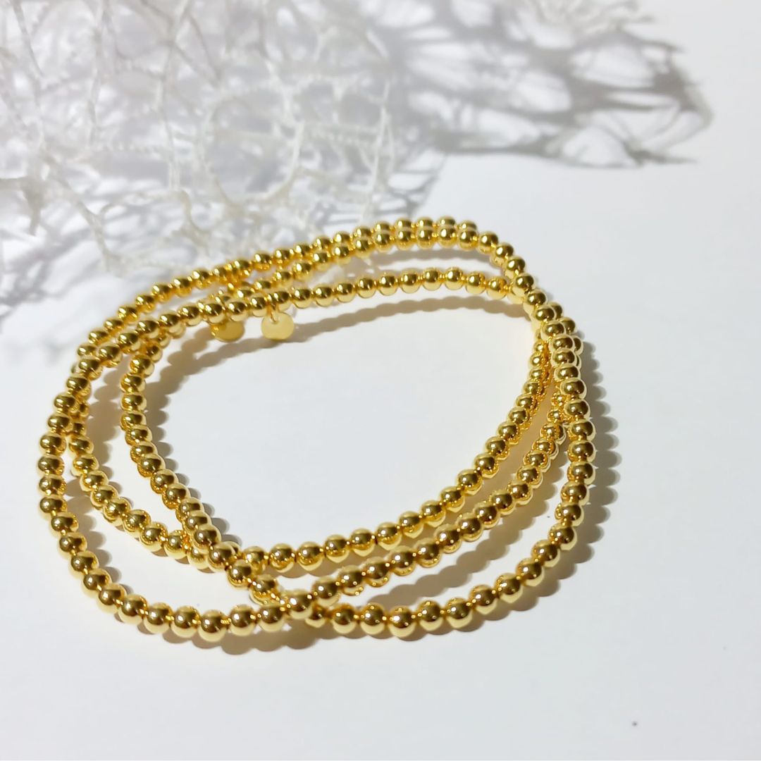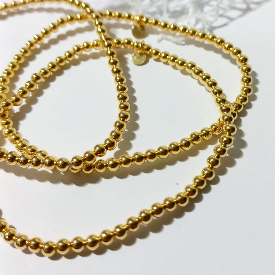 ¿Qué te parece este brazalete de bolitas de plata de ley 925mm chapadas en oro de 18kt? hijos monísimos. Son 3 hilos de bolitas doradas de 3mm con extensibles para que puedas poner y quitar con facilidad. Sin cierre. Son tan versátiles que podrás presumir con ellas para un look casual o para un evento elegante. Mami, si las ves, te van a encantar.
