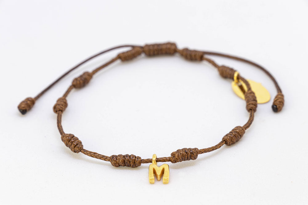 Pulsera plata chapada macramé marrón nudos colección SUYZA letra M en plata de ley 925mm con baño chapado en oro.