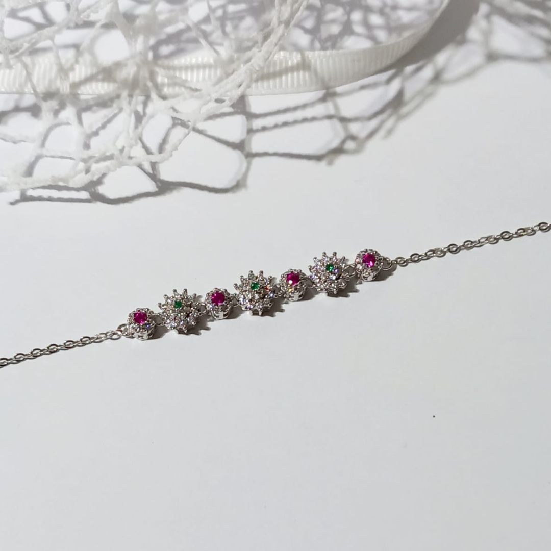 Esta pulsera de plata 925mm con baño de rodio no puede ser más elegante. Si lo que estás buscando es una pulsera elegante y finísima, ya la has encontrado. Con 7 rosetas de diferentes tamaños con circonitas, rubís y esmeraldas son tan elegantes y brillantes que no pasarás desapercibida. Para un look elegante o para tu día a día, lo importante es brillar.