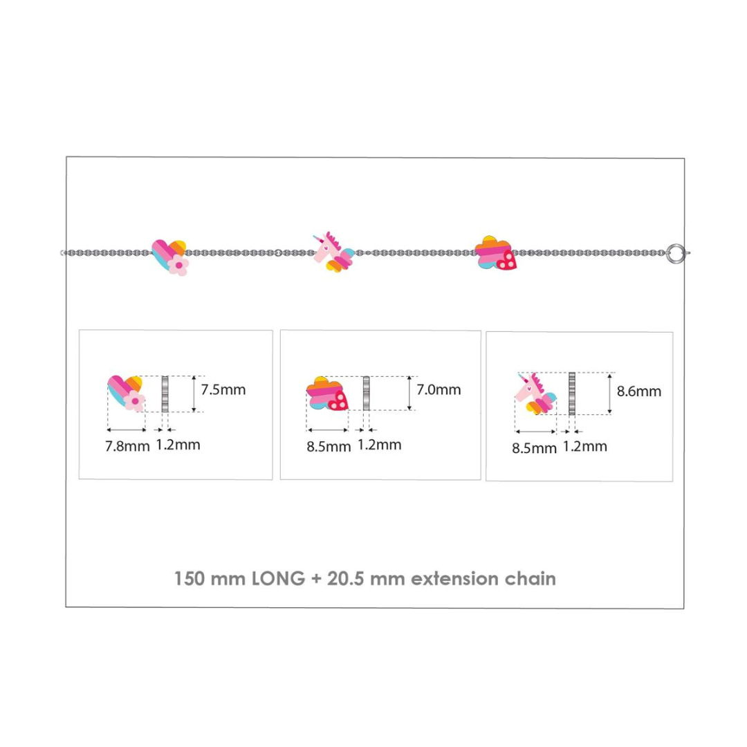 Pulsera de plata de ley 925mm con baño de rodio de la colección Arcoiris esmaltada en colores fucsia, amarillo, azul, rosa con diseño de corazones, flores, nubes y unicornio. Malla tipo forjada a 14cm y extensible con 2 posiciones a 18cm. Lleva cierre de reasa.