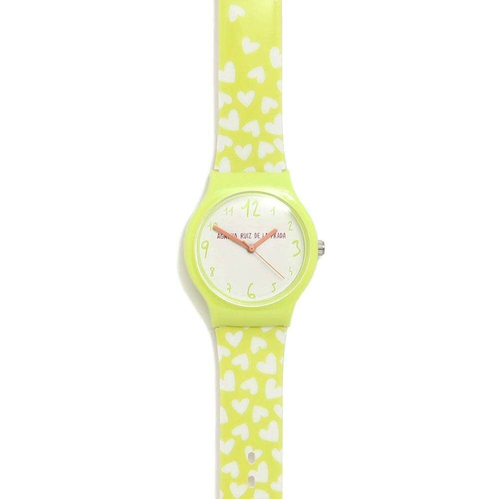 Divertido reloj Agatha Ruiz de la Prada de la colección Flip con caja color lima y correa de PVC lima con miles de corazones. Esfera blanca con números lima. Maquinaria japonesa Seiko.