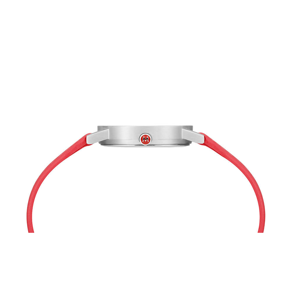 Reloj suizo Mondaine SBB EVO2 con caja de acero pulido de 30 mm y cristal mineral endurecido. Correa de piel vegana en color rojo, cómoda, resistente y ecológica. Funciona con mecanismo de cuarzo de alta precisión. Diseño elegante, discreto y funcional, ideal para el día a día.
